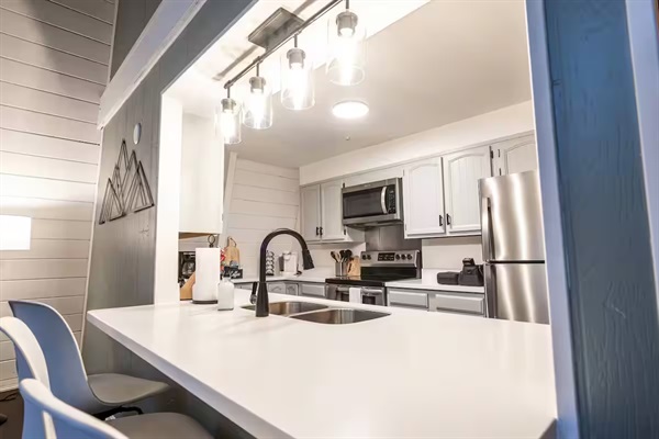 Kitchen features new counters, freshly painted cabinetry, and all new appliances, pot/pans, silverware, etc.